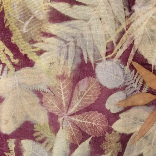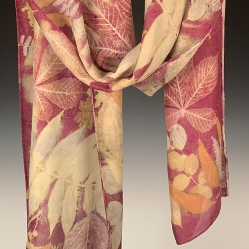 Gorgeous botanical printed scarf by Nancy Evans, in mauve, beige, and tangerine colors. Also called eco-printing or eco-dyeing, botanical printing is the process of wrapping and steaming plant material onto fabric to create various patterns and prints. The dye material is placed onto the fabric with flowers, leaves, bark, branches or seeds, and then folded and wrapped around a pole or tied into a bundle. When heat or steam is applied, the colors release onto the fabric, transferring the shapes of the plant material directly into the fibers. With layers of ferns and a variety of leaves, this elegant scarf may quickly become your favorite accessory.