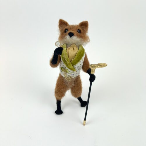 Meet Dapper Mr. Fox, a charming needle-felted character by Katie Pugliese. Dressed to impress in a tailored vest with velvet trim, pocket watch in hand, and a jaunty walking cane, this whimsical fox is full of personality and old-world flair. Carefully crafted with expressive details and a playful stance, he’s a delightful conversation piece for collectors and lovers of imaginative fiber art. He measures 8″ tall Not suitable as a toy.