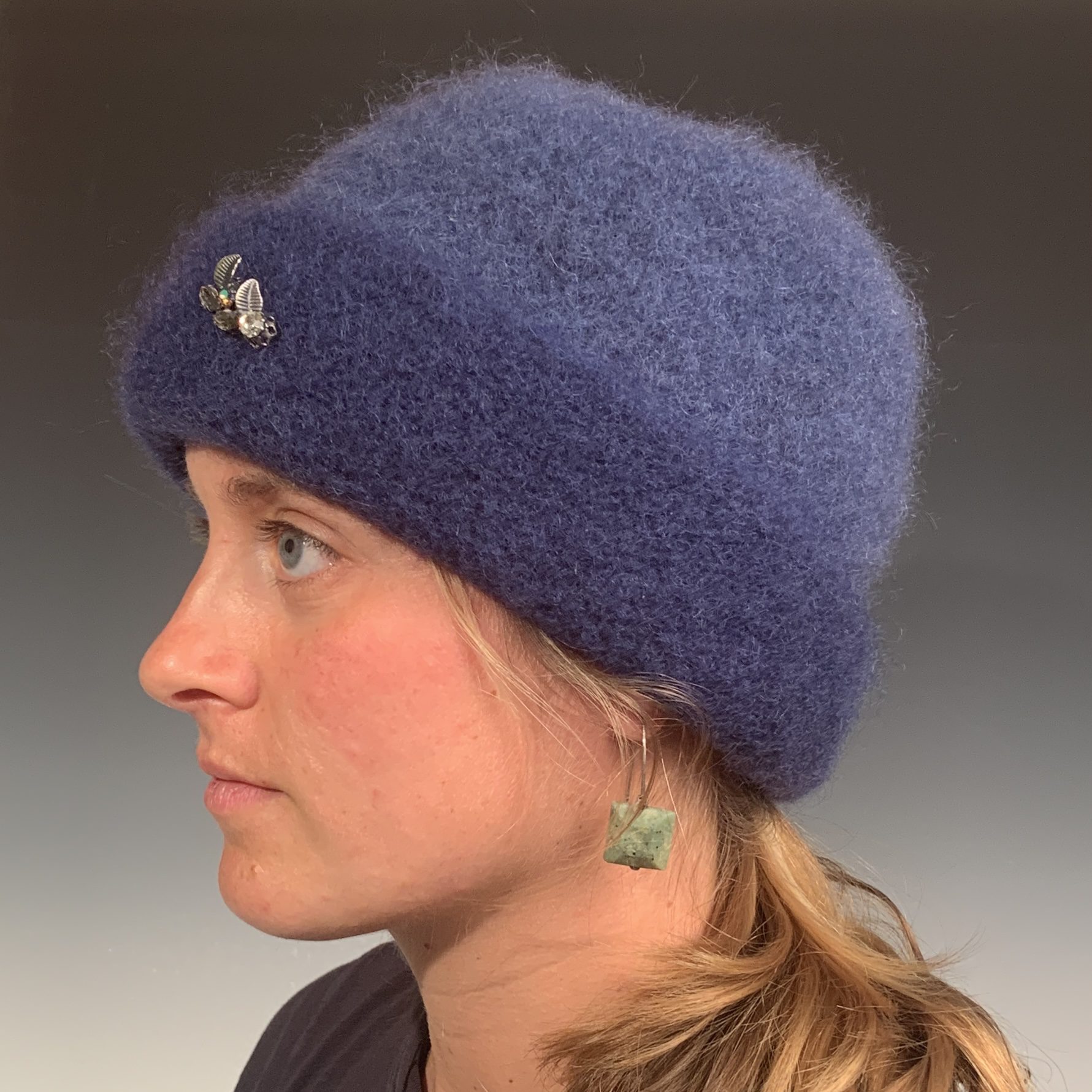 Warm and stylish felted denim blue 2-tone hat by Donna Wilson with leaf pin. Close to a periwinkle color, this hat looks gorgeous with any jacket or coat, and protects you from rain, wind and snow. Donna’s beautiful felted hats comfortably fit a size 21- 23″ head, but if the fit isn’t perfect, they can be stretched and reshaped slightly by throwing them in a cold water wash in the machine, reshaping them to your comfort while wet, and then setting them aside to air dry. Vintage pins may vary.