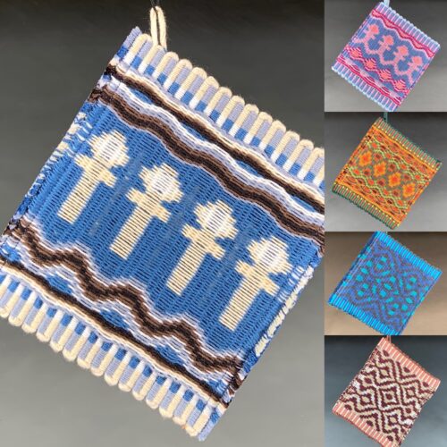 Beautiful handwoven potholders by Erica Pfister. Designed with patterns from ancient Egyptian Card Weaving (1200 BC), some of which include the “ankh figure,” denoting life and prosperity, and the zigzag “river” motif, representing the Nile’s fertility and abundance. Made with a blend of cotton, wool, and rayon, these potholders function beautifully to protect your hands, and look beautiful hanging in your kitchen.