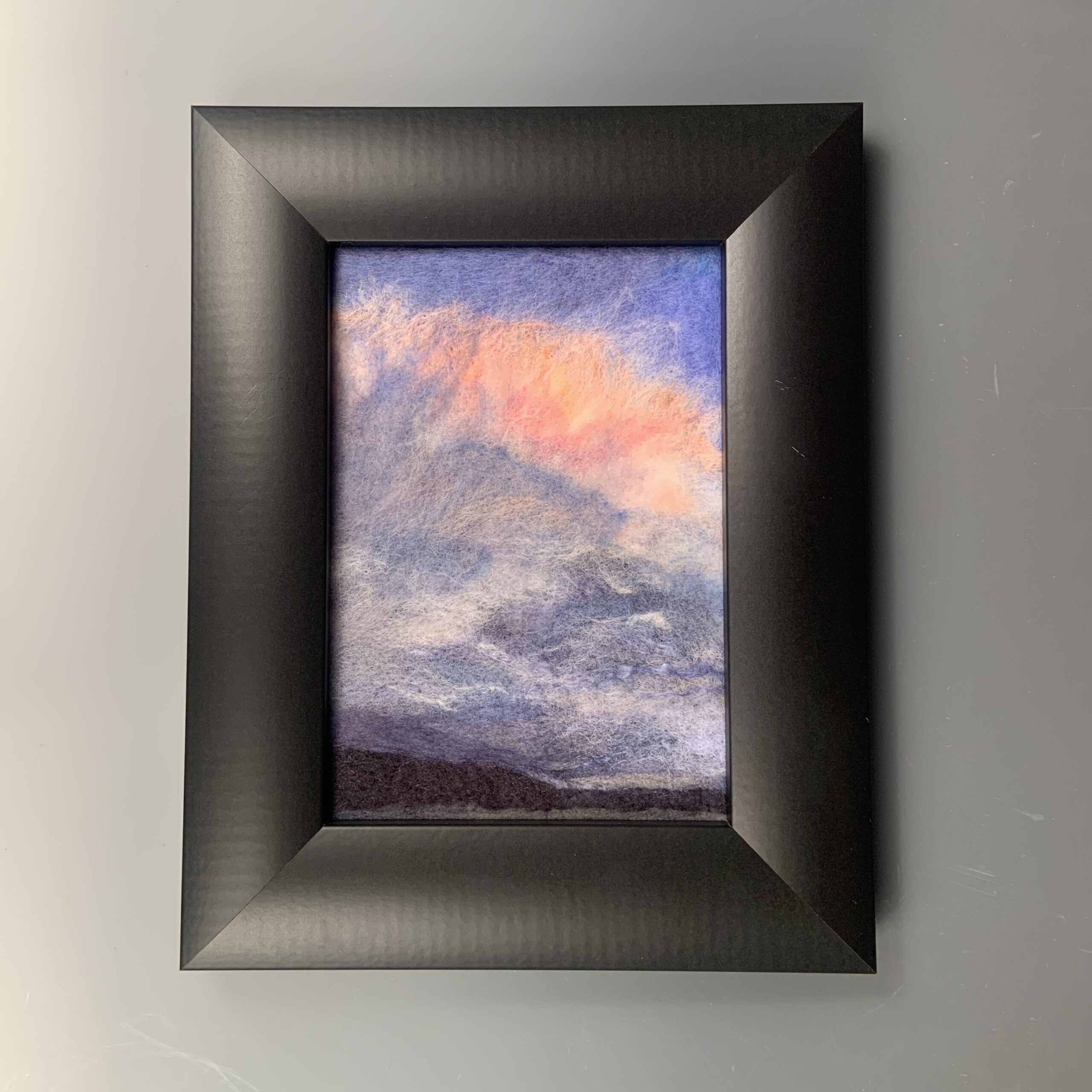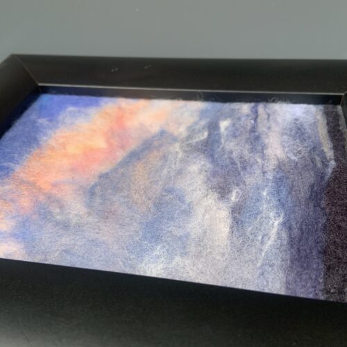 Beautiful framed artwork by Christine Pellerin, featuring the sky at dusk or sunrise, made from colored needle felted wool! Christine uses commercially-dyed, unspun wool fiber and “paints” it onto a base of wool or wool/synthetic blend felt fabric using a barbed needle. She then hand sews the completed piece onto a foam core mounting board before framing. Intentionally framed without using glass, her work beautifully showcases the soft supple textures of the fibers as well as the incredibly detailed image. Best displayed out of direct sunlight.