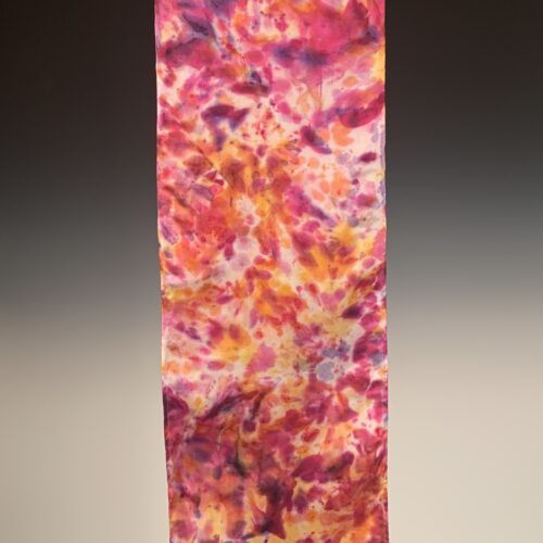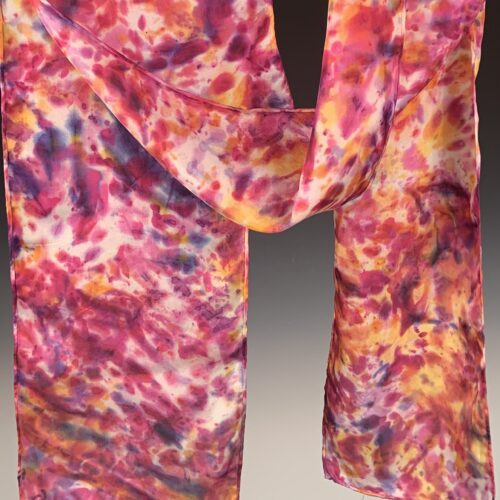 Vibrant silk scarf by John Scott, created with the fascinating process of ice-dyeing. This is a technique in which ice cubes are placed on top of fabric that has been prepped with dye and soda ash. As the ice melts, the dye dissolves and migrates into the fabric, creating watercolor-like patterns, with whimsically distributed unpredictable designs. Each scarf is individually dyed to create an exceptional variety of depths and tones, sometimes changing from one end to the other. This unique, 100% silk scarf is colored with red, magenta, and purple with orange-yellow accents.