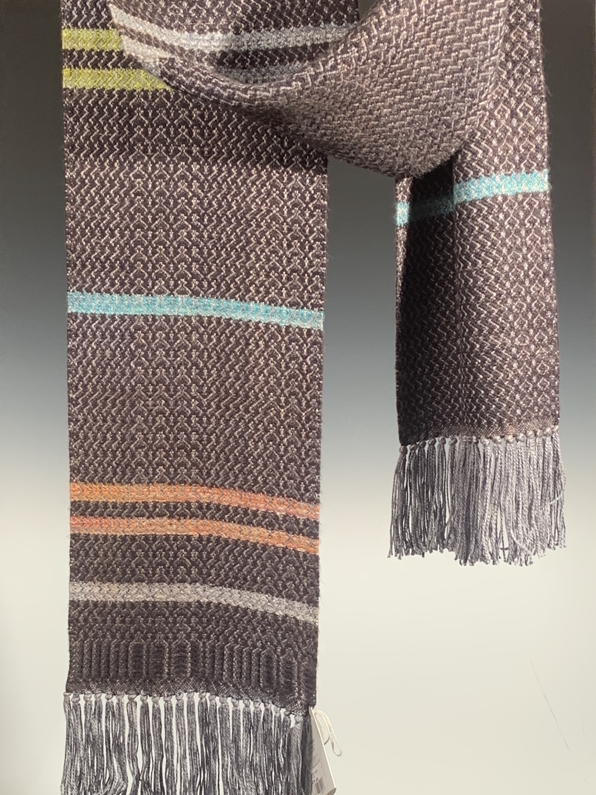 This gorgeous scarf by Douglas Alan Masury was handwoven from natural bamboo fiber, a renewable resource that has natural antibacterial and antimicrobial qualities. Bamboo has become popular fiber material for its soft and luxurious touch that is warm in cold weather, yet relatively cool in warmer weather. Doug’s scarves are all woven from fiber he hand dyes himself. The beautiful patterning you see in the threads emerges, not by switching colors, but rather as he weaves a repetitive pattern with his multicolored skeins. Each of his scarves is completely unique for this reason. With quietly transitioning colors, and soft supple textures, this scarf may quickly become your favorite accessory.