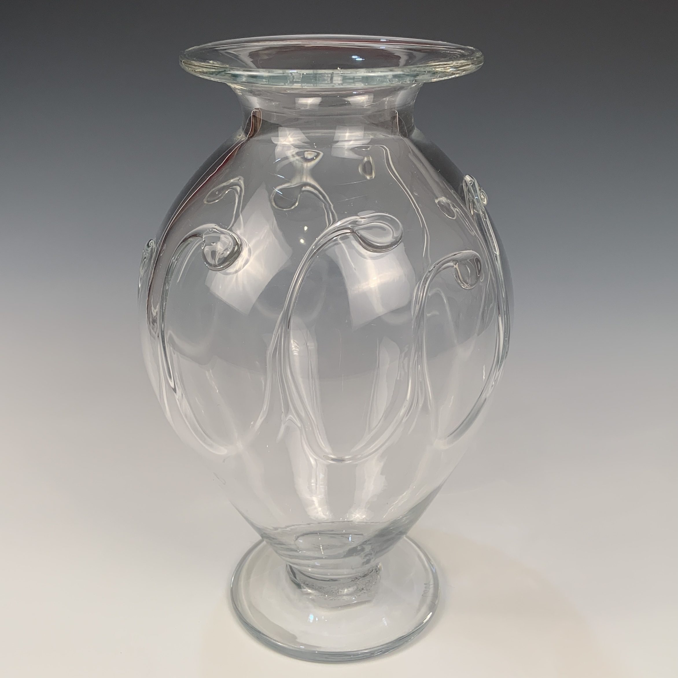 Beautiful transparent blown glass vase by Bruce Cobb, crystal clear, with his classic “Lily Pad” raised surface design. His technique is based on the (19th century American) Lily Pad Design, giving the work a clean, contemporary look. Often referred to as “waves,” the Lily Pads, besides being decorative, also perform as grips, making it less likely to slip out of one’s hand. They also provide extra sturdiness to the work. A true League of NH Craftsmen classic. Enjoy fresh flowers in this handblown glass work of art.