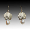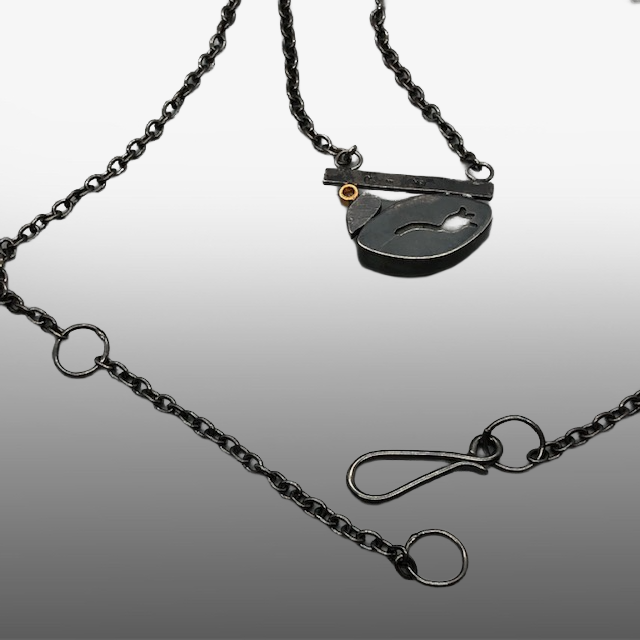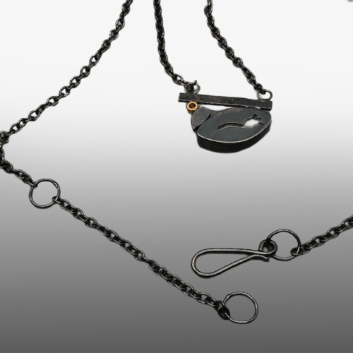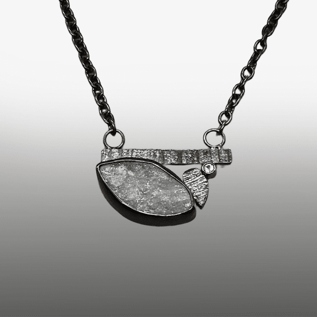 Rough aquamarine necklace by Barbara McLaughlin. Oxidized sterling silver with a white sapphire in a 18k gold bezel , about 1″diameter, on a 17.5-20″ chain with a handmade clasp.