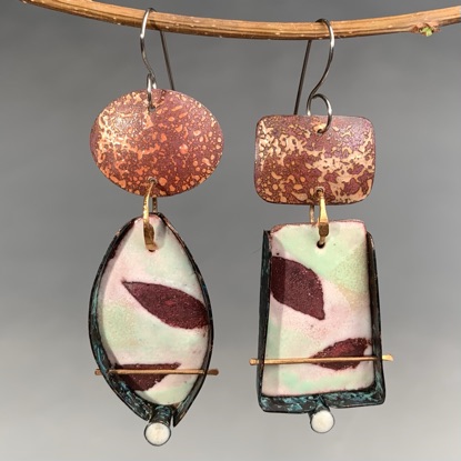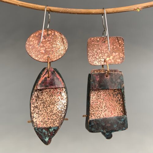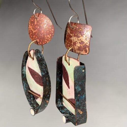 Modern, sophisticated, and sculptural earrings by Kathleen Curtin. Kathleen works with various metals and materials to create one-of-a-kind sculptural jewelry, inspired by structures in both the natural and developed world. These funky and slightly mismatched earrings are made from copper and brass with patina and enameled surfaces. The ear wires are hypoallergenic surgical steel.