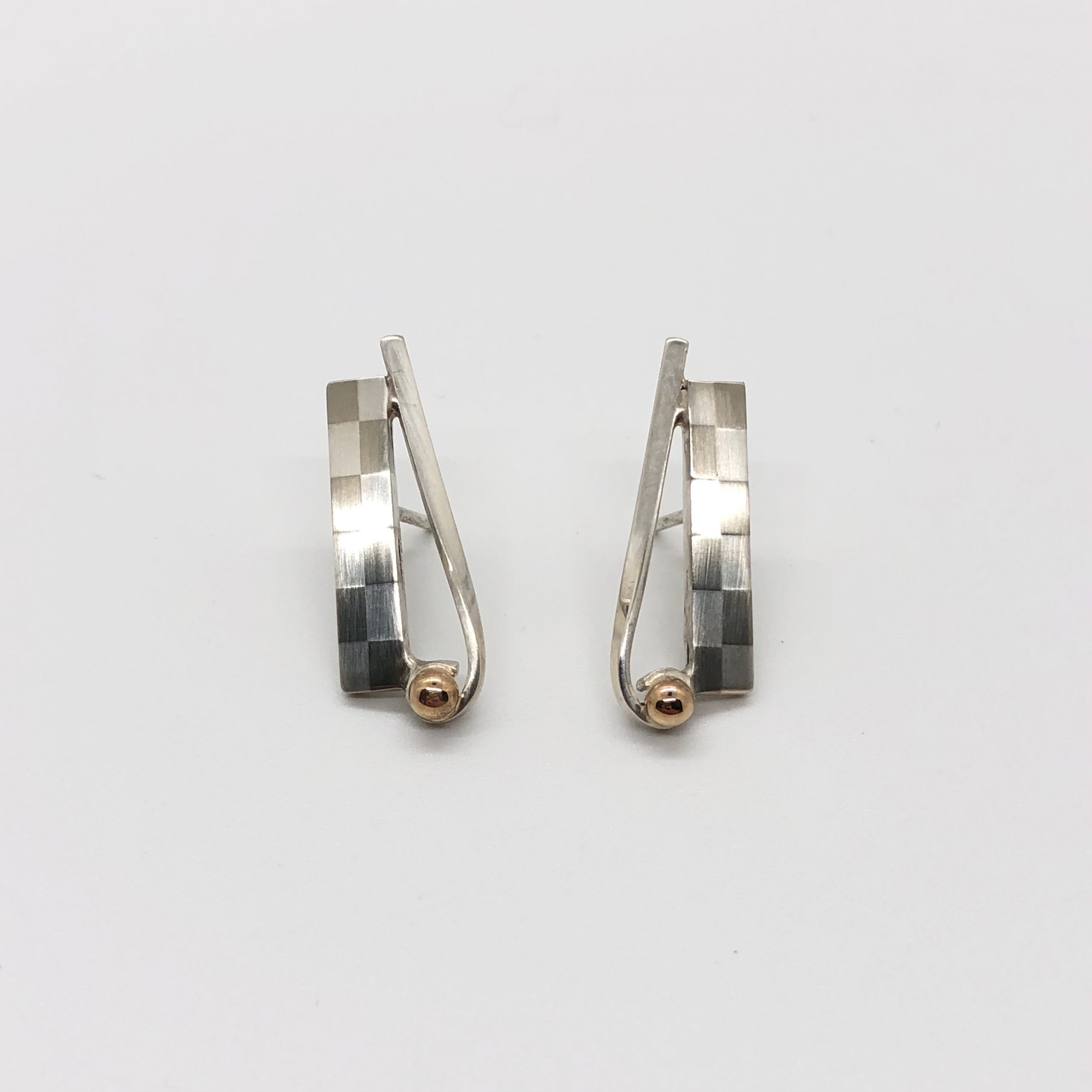Checkerboard post earring fabricated by Anne Behrsing, sterling silver and 14k gold ball. About 1″, with sterling silver ear post. Abstract book matched earrings with hand made checkerboard design.