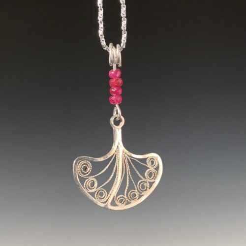 Beautiful sterling silver filigree pendant by Marcia Rae. Inspired by the movement, rhythm, pattern and cadence that she finds in music, poetry and nature, Marcia Rae uses ancient and contemporary techniques to create her jewelry. This particular gingko leaf design is adapted from an ancient filigree technique and is accented with four faceted ruby beads.