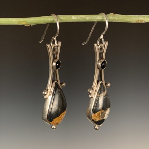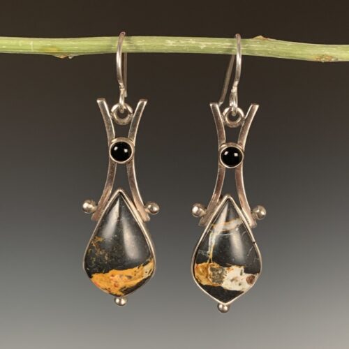 Sophisticated sterling silver earrings by Diana Beaulieu, featuring a pair of bezel-set black onyx and iron buffalo stones. Finished with with sterling silver earwires, these artistic and unique earrings are sure to prompt attention and compliments.