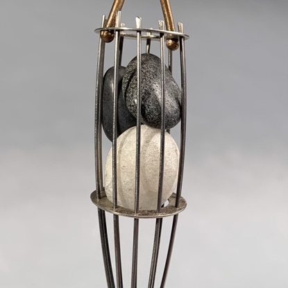 Sophisticated and sculptural river stones pendant by Kathleen Curtin. Kathleen works with various metals and materials to create one-of-a-kind sculptural jewelry, inspired by structures in both the natural and developed world. In this unique pendant, nature meets the artistic industrial with three small natural river stones inside a sculptural “cage.” The pendant hangs from a rubber cord with a handmade hook clasp.