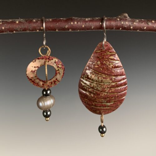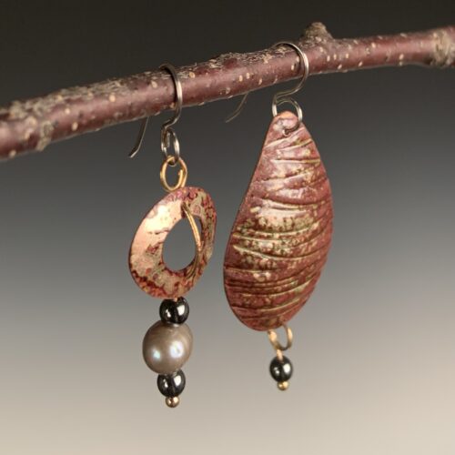Sculptural “Paired Individual” earrings by Kathleen Curtin, made from enameled textured copper, brass, pearl, and hematite. Kathleen works with various metals and materials to create one-of-a-kind sculptural jewelry, inspired by structures in both the natural and developed world. Finished with sterling silver earwires, these earrings are modern, sophisticated, and artistic.