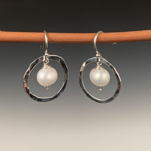 Beautiful, brushed sterling silver hoop earrings by Denise Graves, with iridescent round pearl drops. The brushed silver on these earrings gives them a brilliant white color, emphasizing the soft hammered forms and making them “pop”. A great pair of earrings for everyday.