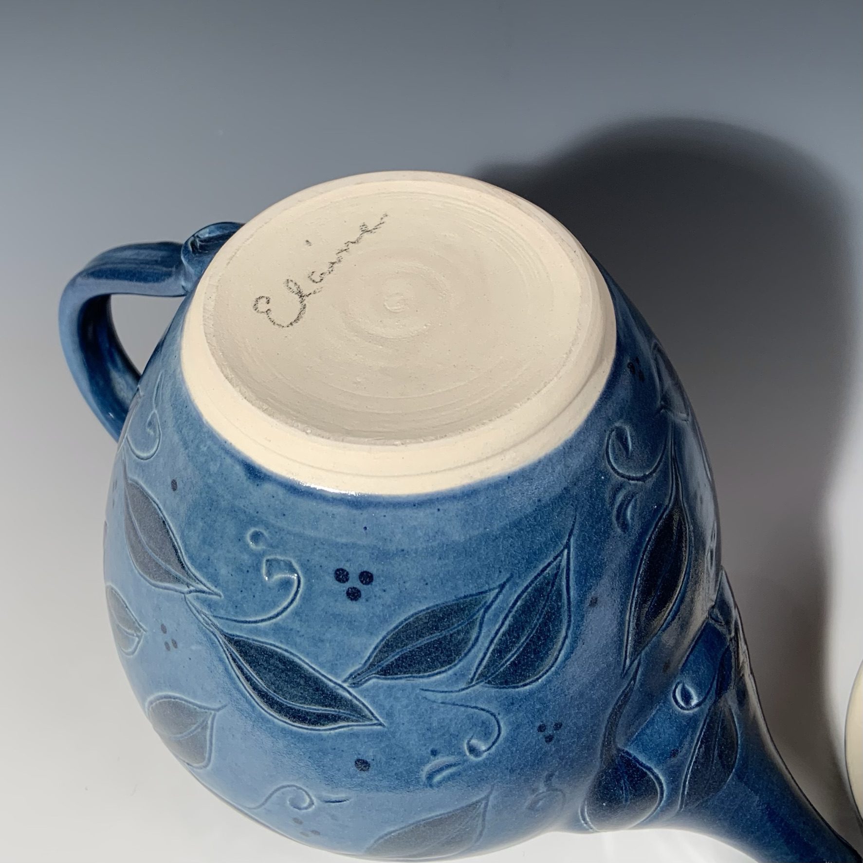 Steep your tea in this beautiful blue teapot by Elaine Fuller, with hand-painted and lightly carved leaf detail. Lightweight and comfortable, but also strong and durable. A great gift for a serious tea drinker or a lighthearted art lover. Microwave and dishwasher friendly. (Not intended for stovetop)