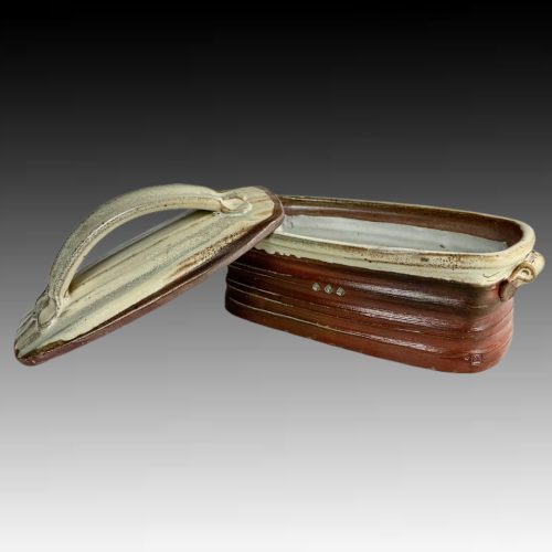 Ceramic lidded casserole handcrafted by Tom White. This is food and oven safe! Measures about 10” L x 5 3/4” W x 3 1/2” H.