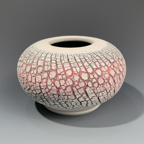 Medium sized sphere that is both functional and artistic. The artist, Lars Turin, made this wheel-thrown sphere using his unique technique of crusting the surface of soft clay with sodium silicate and a torch, and then stretching the still-soft clay to create controlled surface cracking. He then enhances the cracking with various colors and removes it from the smooth, white clay surface to create a dramatic contrast. This particular piece has red and black cracks and the interior is finished with a smooth black glaze. Signed by the artist.