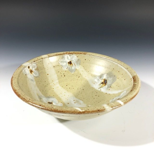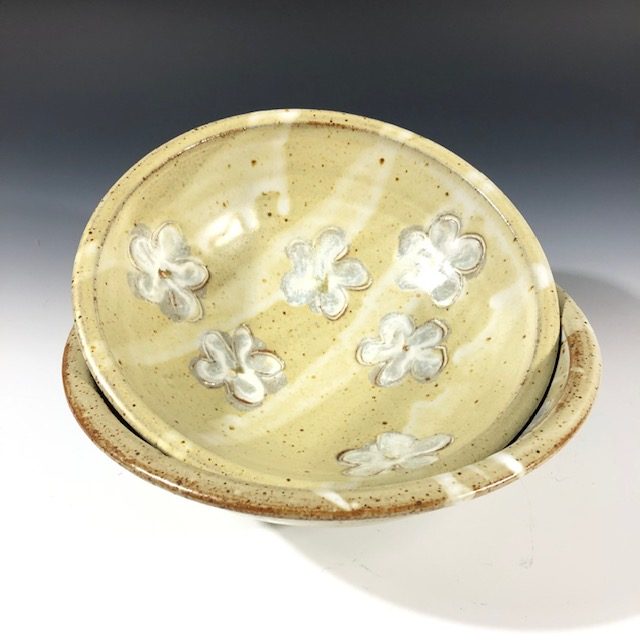 Ceramic bowl hand thrown by Maureen Mills, stamped with white slip and layered with 2 glazes to give a floating floral pattern. Accents of iron dot each flower as well as lightly speckling the glazes. In matte buttermilk yellow glaze with white flowers.