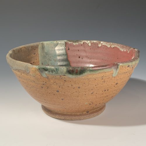 Tri-fluted stoneware bowl by Tom White, with yellow salt, turquoise, and red glazing. Tom’s work is strong and durable, with a beautiful warmth and weight. This bowl would be a great size for serving a curry or large salad for one, salad for two, and also great for serving salsa or guacamole at a party. Microwave and dishwasher safe.