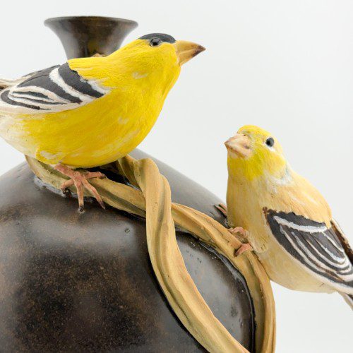 This vase by Richard Roth is a striking piece of art, featuring a pair of hand-sculpted goldfinches perched gracefully along its side. The deep, earthy tones of the vessel contrast beautifully with the birds’ vivid yellow plumage and finely detailed black-and-white wings. A twisting vine element ties the composition together, giving the vase both elegance and a lively sense of nature captured in motion. It measures 9.75″ tall with a .5″ opening.