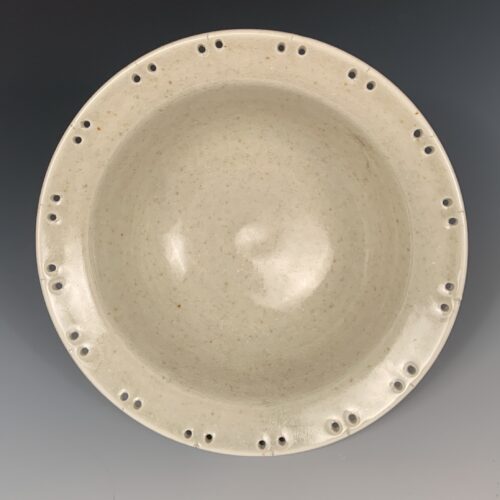 Elegant white stoneware and celadon jewelry bowl by Andy Hampton, with subtle blonde speckling in the glaze. Equipped to hold sixteen pairs of earrings around the rim, and necklaces, rings, and/or bracelets within, this beautiful bowl is a clever solution to organize your jewelry. Quiet in nature, with good functionality, and a strong Japanese aesthetic, Andy’s pottery reminds us to mindfully enjoy the simple things in life. Microwave and dishwasher friendly.