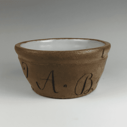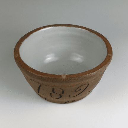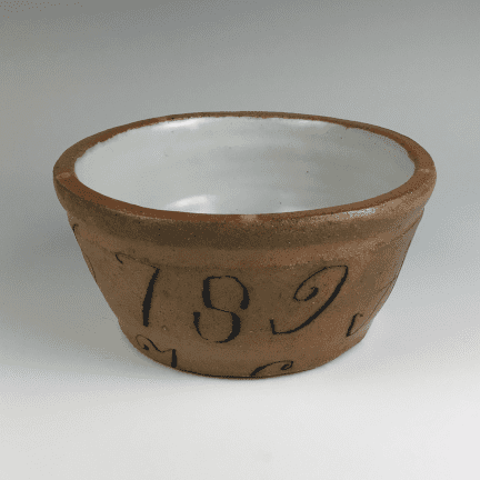 Beautiful large stoneware bowl with off white interior, decorated with carved letters.