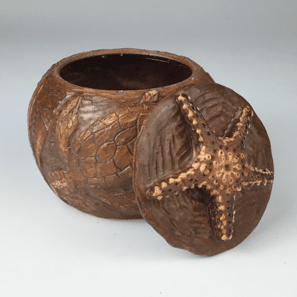 Handmade ceramic and hand-carved covered jar with swimming sea turtles and a starfish by Wendy Jackson.
