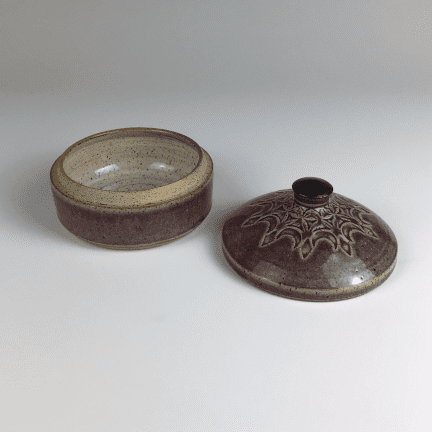 Beautiful purple-glazed ceramic lidded sugar jar with a snowflake pattern on the top of the lid.
