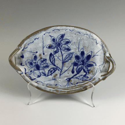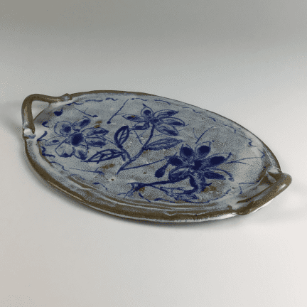 Ceramic tray with blue flowers and handles.