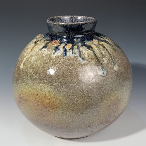 Woodfired “Moon Jar” by Grace Kerr, with a dark midnight blue glazed interior and rim, and a textured natural ash glazed exterior, ranging from tones of brown and gold to tan and off-white. Wood-firing is very time consuming process as the wood fueled kiln must be stoked continuously by hand, usually for days! The natural wood ash from the firing process melts onto the surface of the pottery during the firing, giving the clay a toasty natural brown color and the glazes a rich luscious depth. This moon jar has an ancient, timeless feel, and functions as a flower vase or simply as decorative piece for your home.