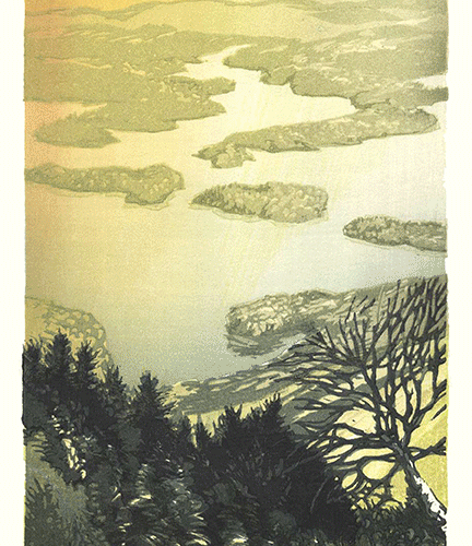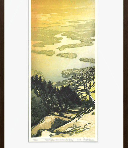 Color woodblock print. Either matted or in your choice of cherry or cambria wood frame with UV 70 non-glare glass.