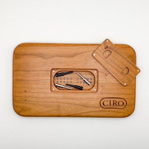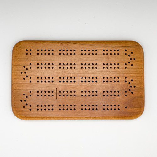 This solid cherry “squared up” 2 lane cribbage board with peg pocket is handmade by Russ Scaduto. It measures approximately 9″ x 5 1/2″.
